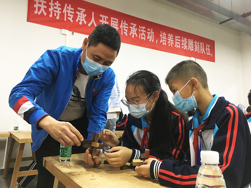 2020年12月2日,2020年大涌红木家具(传统雕刻技艺)非遗传承体验日活动盛大举行。广东省非物质文化遗产传承人李仲良先生,与广大学子一起探索鲁班锁背后的故事。一场诉说匠人精神的艺术沙龙,在少年们的手中传承下去。