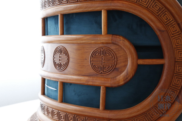 局部装饰的回形纹、团寿纹,既有绵延流长的祥瑞含义,又恰如其分地与“圆”和“弧”的设计手法交相辉映,改变了红木家具凝重拘谨的格调。